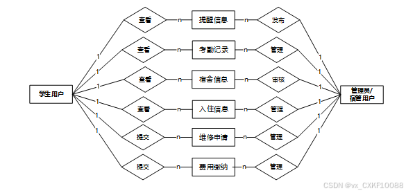 - 入住信息管理:管理员负责学生入住的安排和记录,包括住宿日期、宿舍号及入住情况。