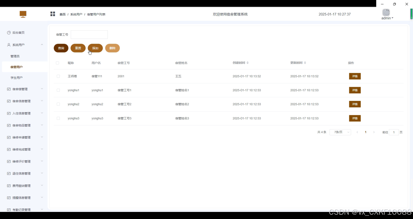 - 用户管理:管理员可管理所有用户账户,包括管理员、宿管用户和学生用户,进行新增、编辑、删除和权限分配。