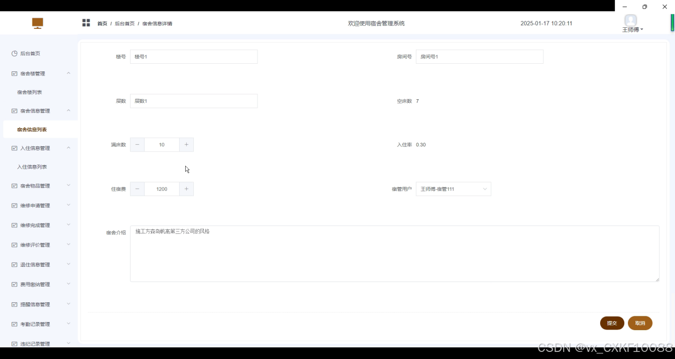 - 后台首页:学生用户在登录后进入后台首页,首页展示个人基本信息(如姓名、学号、宿舍号等)、最新的宿舍管理通知、系统提醒(如费用缴纳、维修申请进度等)以及宿舍内的动态信息。用户可以直观地看到自己需要关注的事项。