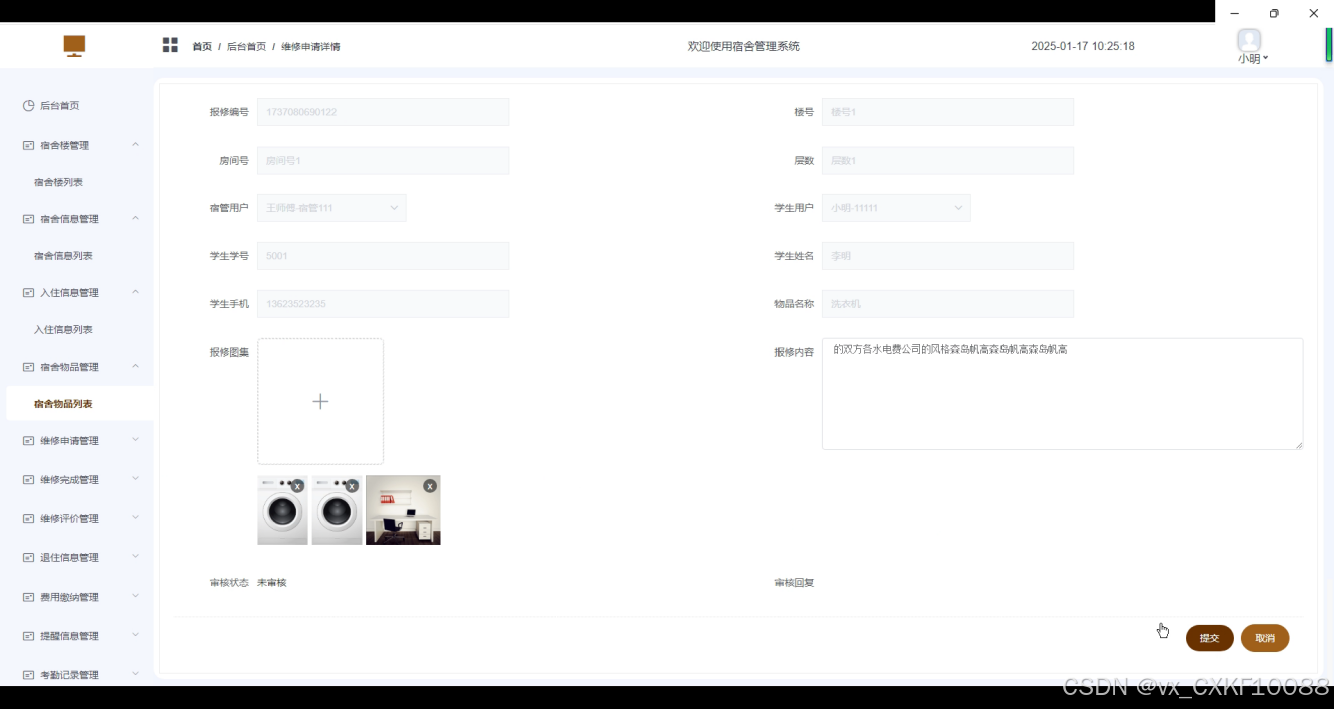 - 维修申请管理:学生如果遇到宿舍内设备故障(如水管漏水、电器损坏等)可以通过此功能提交维修申请。学生可以填写详细的故障描述并上传照片,宿管员会收到维修请求并安排维修人员处理。
