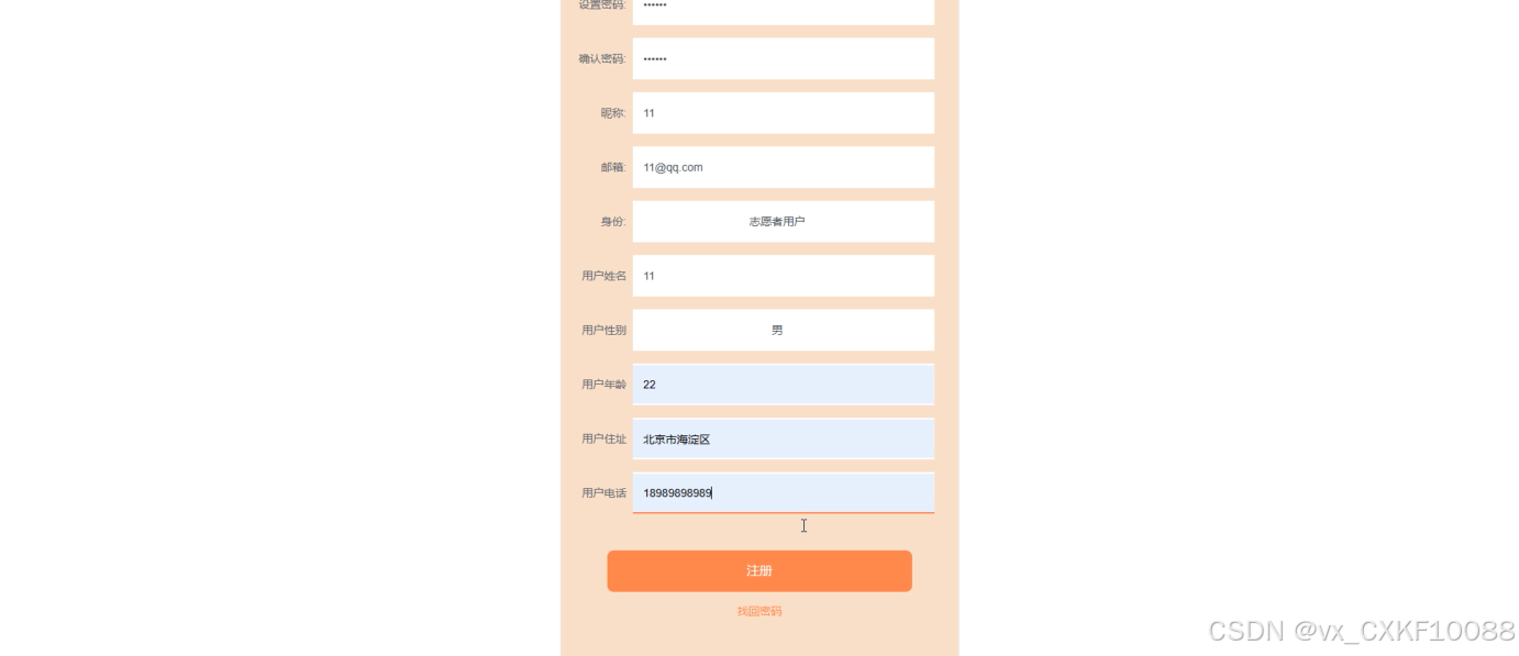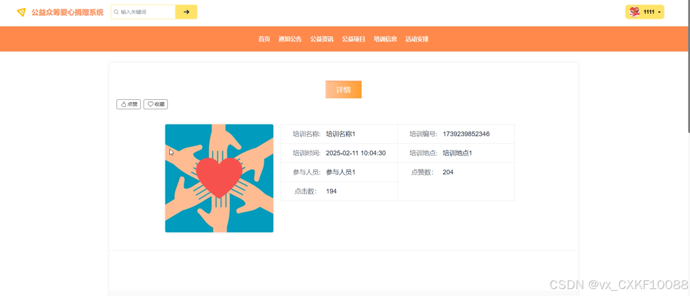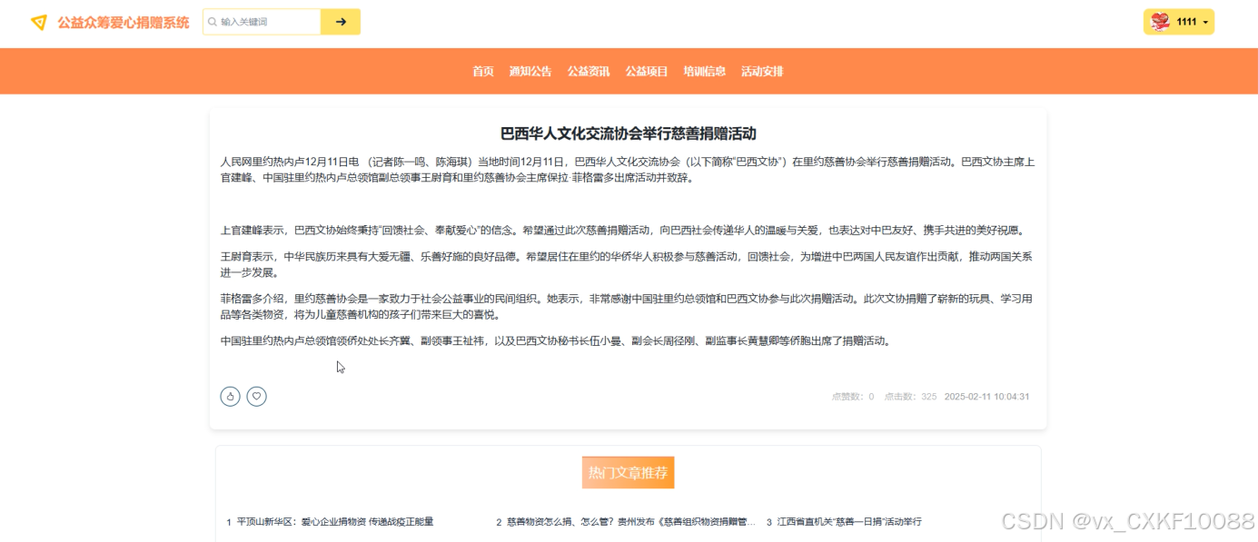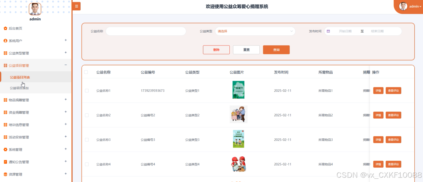 The system implements a variety of functional modules, including the volunteer user terminal and the administrator background. Volunteer users can browse the homepage, notices, public welfare information, participate in public welfare projects and training activities, etc.; Administrators are responsible for reviewing goods and fund donations, managing public welfare types and projects, and maintaining system resources. The system uses Spring Boot as the back-end framework, combined with the powerful functions of Java language and the support of MySQL database to ensure the stability of the system and the security of data.