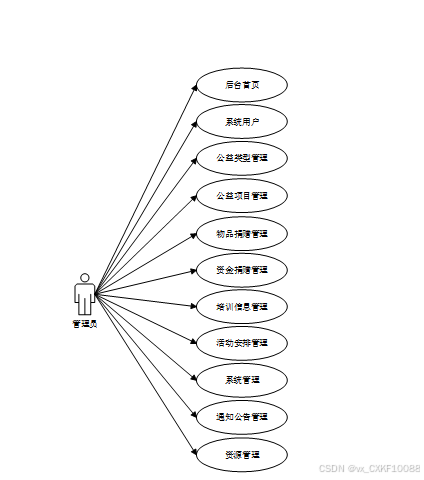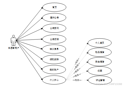 系统用例分析是对公益众筹爱心捐赠系统中各个功能模块的用户需求和行为进行分析,以识别和描述不同的用户用例。通过系统用例分析,可以深入了解用户在系统上的操作流程和交互方式,为系统设计和开发提供指导,并确保系统能够满足用户的需求和期望。