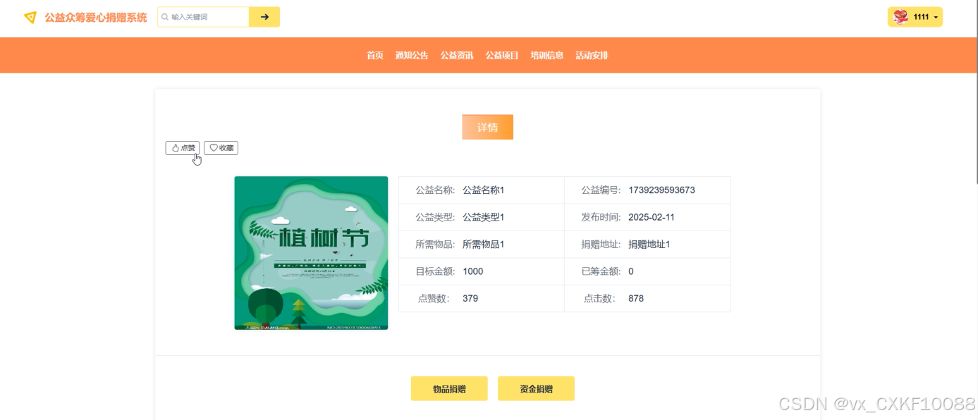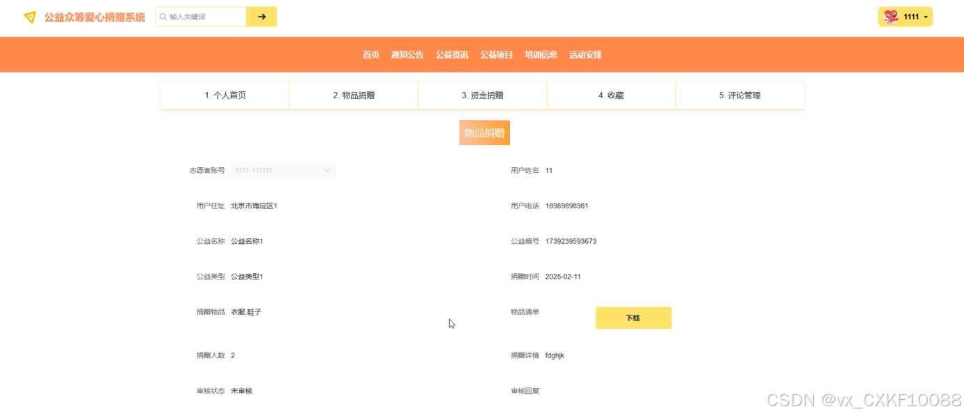 个人中心:包含物品捐赠、资金捐赠、收藏、评论管理等子模块,便于用户跟踪自己的捐赠记录和互动情况。