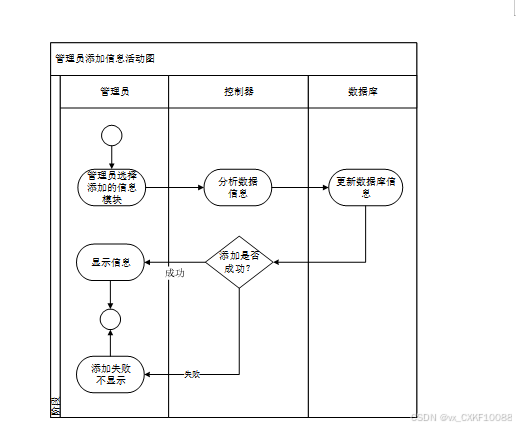 此活动图描述了管理员添加信息。管理员可以通过信息管理模块页面选择要添加的基本信息。添加成功传入数据库中,失败则不添加。管理员可以保存信息并更新系统中的信息。管理员添加信息功能的活动图如图3-4所示。
