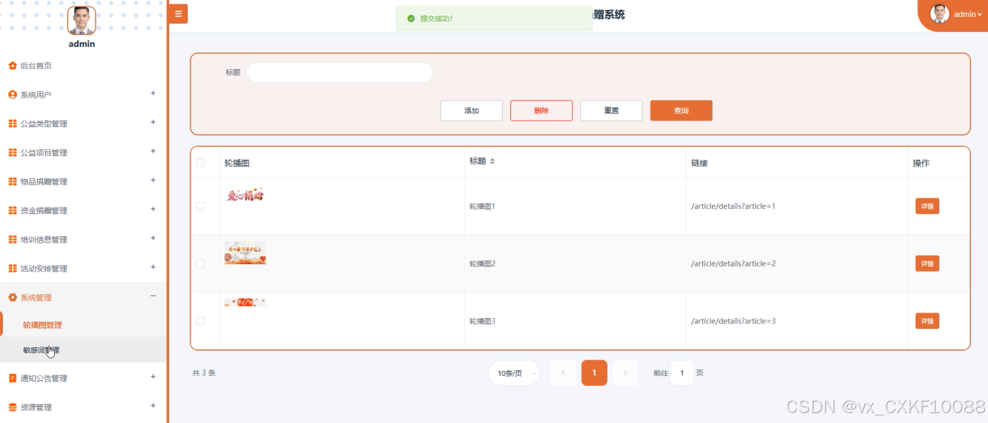 系统管理模块下设有轮播图管理和敏感词管理两个子模块,前者让管理员能够轻松上传、编辑或移除首页展示的轮播图片,美化界面吸引用户;后者则提供了设置和管理敏感词汇的功能,自动过滤不良信息,维护社区环境的健康和谐。轮播图管理界面如下图5-21所示。