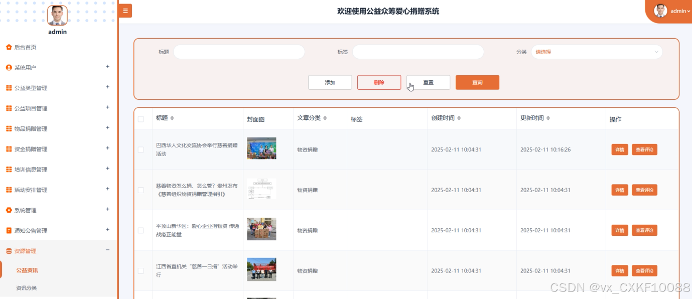 资源管理模块专注于公益资讯及其分类的管理,支持新增、编辑和删除资讯内容,同时维护资讯分类体系。管理员可通过该模块保持资讯内容的多样性和时效性,提升用户体验。资源管理界面如下图5-23所示。