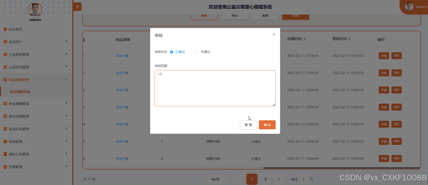 管理员在此模块中审查用户提交的物品捐赠申请,检查物品种类、数量是否符合要求,并决定是否批准捐赠。这一过程确保了所捐物品的真实性和适宜性,保证它们能被合理分配到需要的地方。物品捐赠审核界面如下图5-20所示。