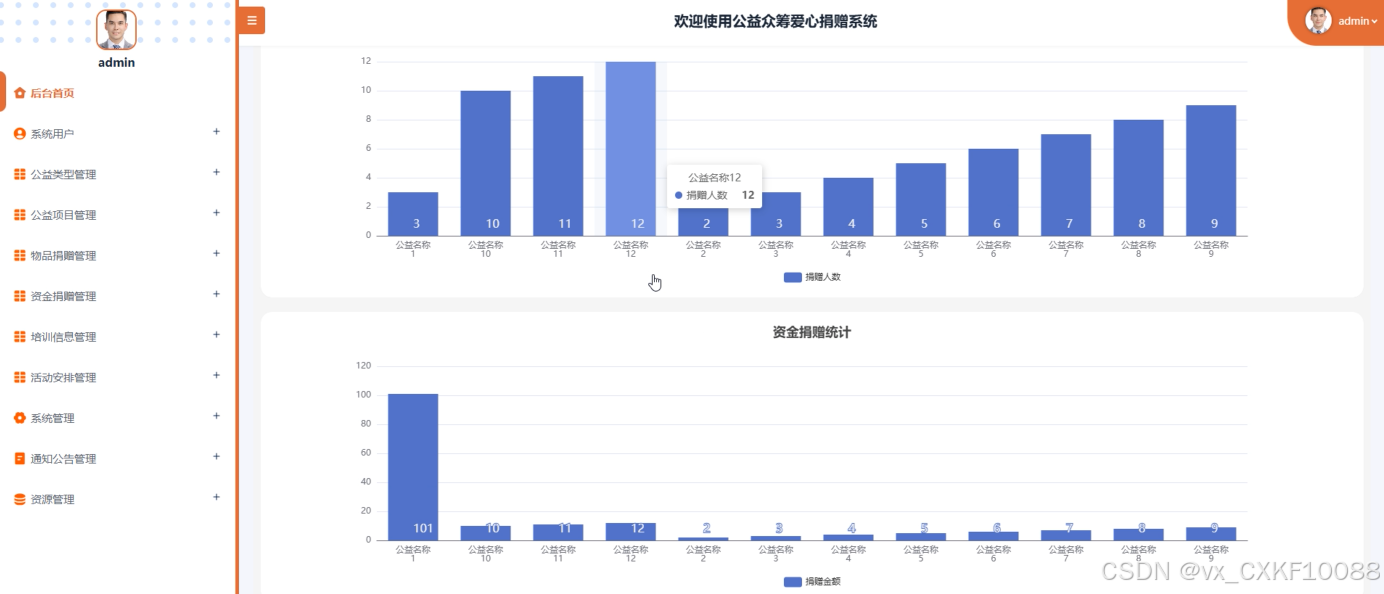 后台首页:提供物品捐赠统计、资金捐赠统计图表,直观展示公益成果。