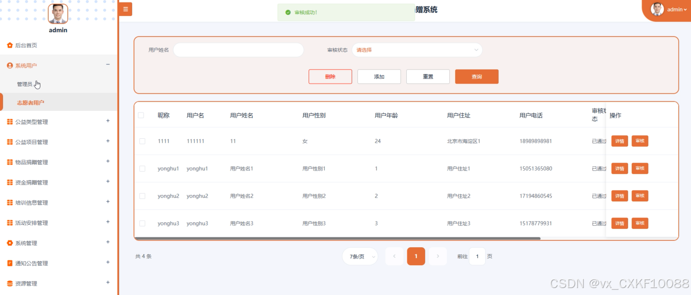 系统用户管理模块为管理员提供了对志愿者用户、管理员的统一管理功能。管理员可以通过该模块查看所有注册用户的基本信息,包括用户名、角色类型和注册时间等,并支持对用户进行审核、重置密码或封禁操作。系统用户界面如下图5-17所示。