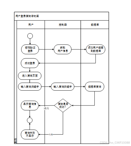 用户注册登录,系统从数据库获取用户数据信息,登录成功用户进入查询页面,用户输入查询关键字,数据库查询用户所输入的关键字,查询成功显示查询的模块信息,查询失败不显示。用户登录查询功能的活动图如图3-3所示。