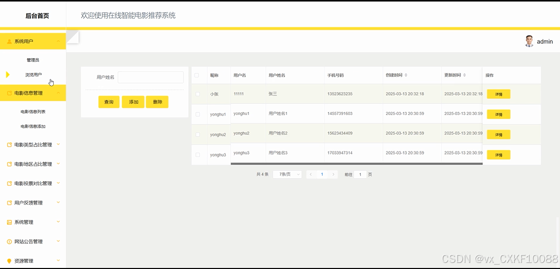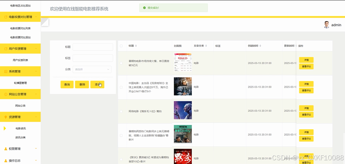 电影信息管理:管理员可以查询、删除、导出和添加电影信息。通过爬取的数据,管理员能够及时更新电影信息,保证电影资料的准确性与时效性。