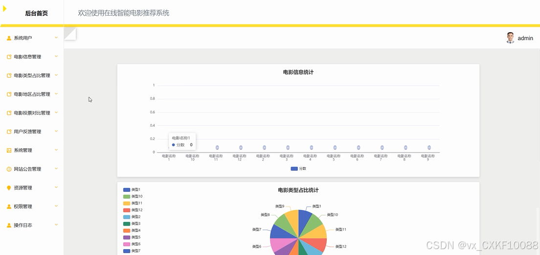 后台首页:后台首页展示了电影投票对比图、电影地区占比统计图、电影类型占比统计图和电影信息统计图,帮助管理员及时了解网站运营的统计数据,并便于决策和优化管理策略。