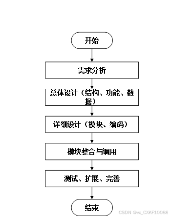 系统开发流程的主要步骤,从需求分析到系统完成的全过程。流程包括需求分析、总体设计(结构、功能、数据)、详细设计(模块、编码)、模块整合与调用,以及测试、扩展和完善,最终完成系统的开发。本系统的开发流程如下图所示