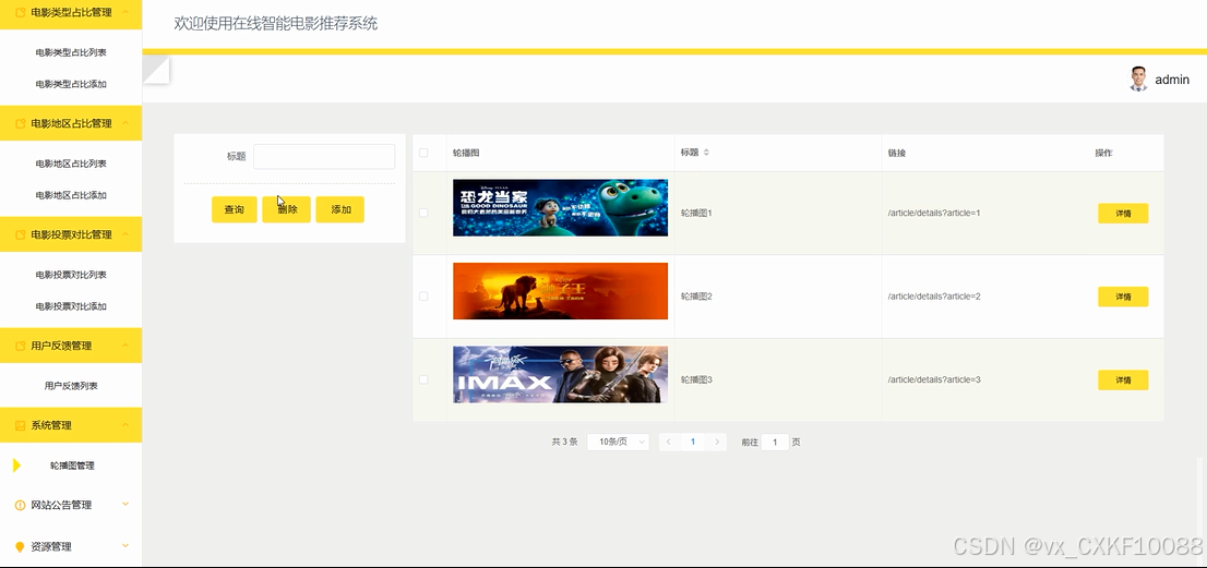 系统管理:管理员可以查询、删除和添加轮播图信息。轮播图是展示电影推广、活动信息的重要视觉元素,通过该功能,管理员可以灵活管理首页的内容展示。