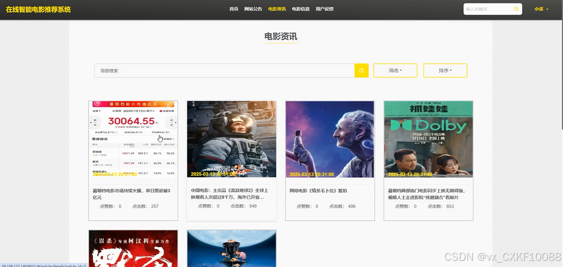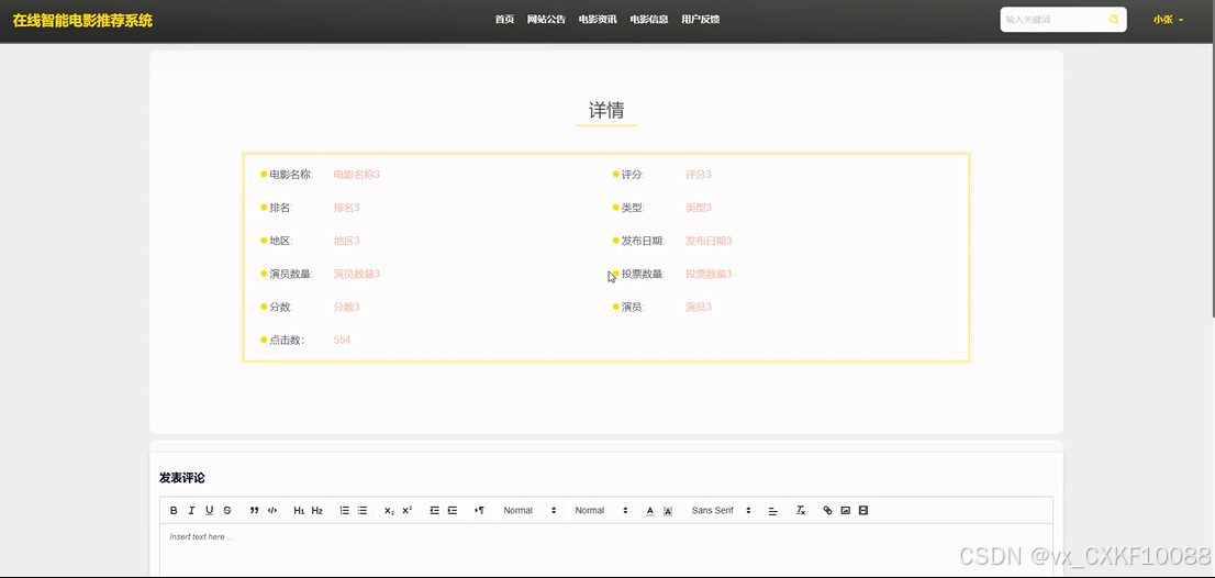 电影信息:用户点击电影信息后,可以查看详细的电影资料,包括剧情介绍、演员阵容、评分等。此外,用户还可以查看其他用户的评论,并通过系统推荐的相关电影进行进一步浏览。
