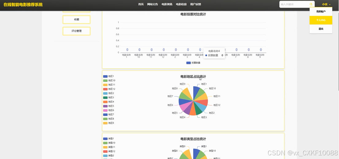 后台首页展示了电影投票对比图、电影地区占比统计图、电影类型占比统计图和电影信息统计图,帮助管理员及时了解网站运营的统计数据,并便于决策和优化管理策略。模块如下图所示。