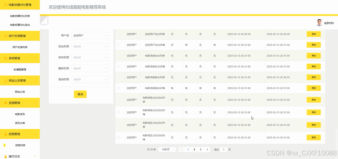 电影投票对比管理:该功能允许管理员查询、删除、导入和添加电影投票对比数据,管理不同电影的投票信息。管理员可导出相关数据,帮助分析电影的受欢迎程度及其他用户偏好。