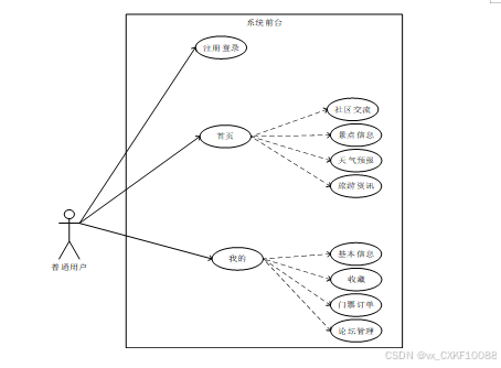 用户在APP端注册登录账号进入用户页面。可以查看社区交流、景点信息、天气预报、旅游资讯、我的(基本信息、收藏)门票订单、论坛管理,用户用例图如图3-5所示。