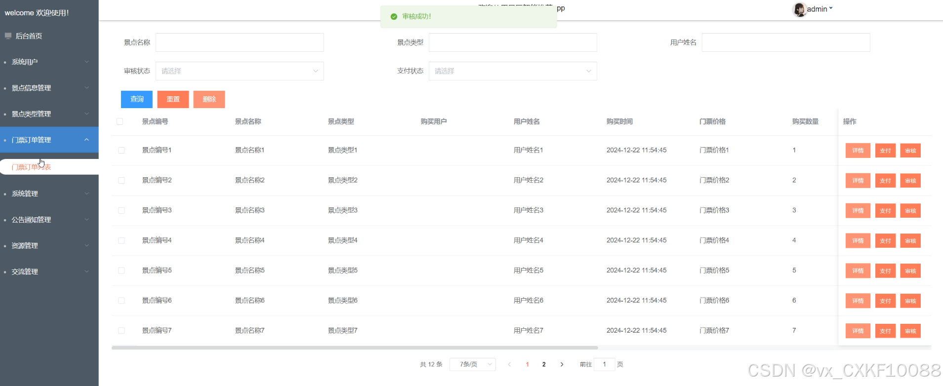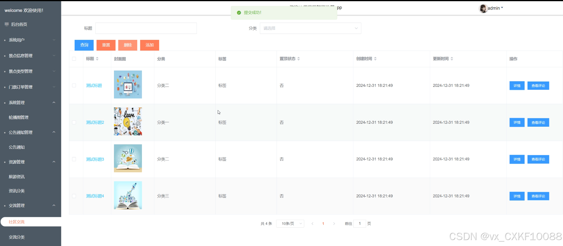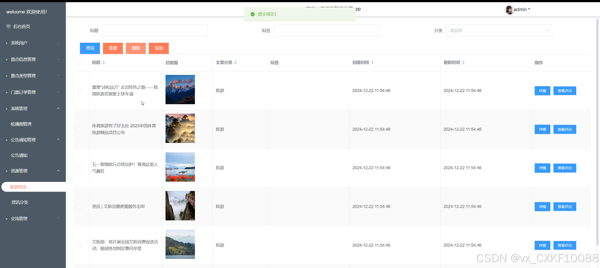 - 后台管理功能:后台管理系统能够帮助管理员管理用户信息、景区数据、评论等内容。管理员可以通过后台对景区信息进行编辑、删除或更新,并对用户的评论进行审核,保障平台内容的准确性和健康性。