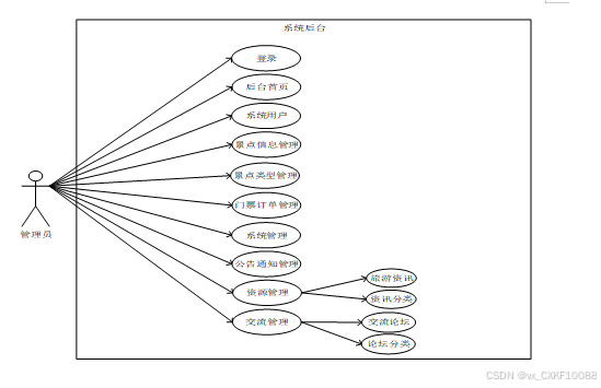 管理员通过输入账号和密码登录到后台管理系统,拥有全部权限包括:访问首页、系统用户、景点信息、景点类型、门票订单、系统管理(轮播图)公告通知管理、资源管理(旅游资讯、资讯分类)交流管理(交流论坛、论坛分类)。