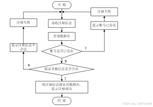 对尚未拥有账号的用户可进行登记以获取账号密码。用户填写登记数据后,当系统接收到这些数据时,它会迅速进行核实。首先,系统会检查数据库中是否有该账户的存在,如果没有,系统会继续核实其他信息,如果有,系统会发出提示,要求用户更改账户,用流程图可以很好的展示出注册的这一过程。