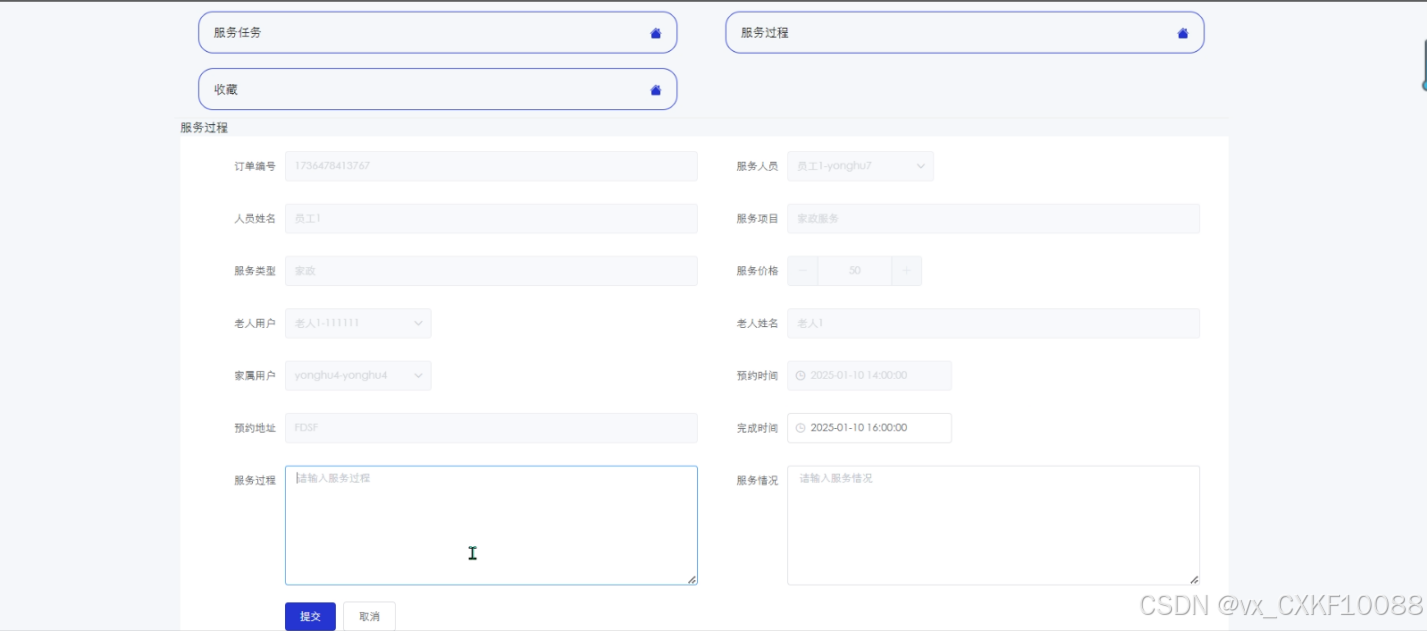 登录:服务人员通过输入由管理员分配的账号和密码进行系统登录。登录成功后,服务人员可以访问其专属的服务界面,进行任务审核、服务项目查看和服务过程记录等操作。