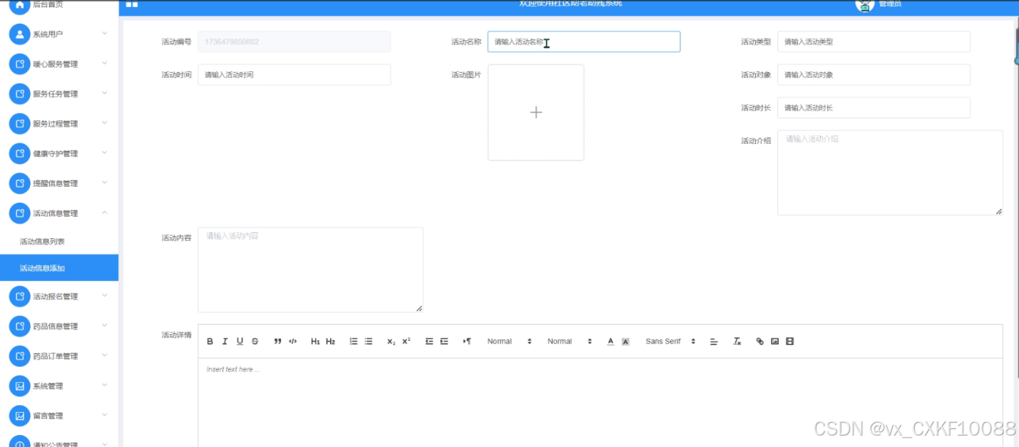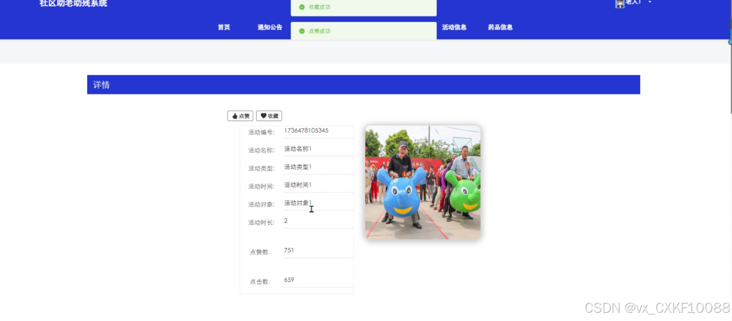 活动信息管理:提供查询、重置、删除和添加活动信息的功能(如活动名称、类型、时间、图片等),管理员可以查看用户对活动的评论。