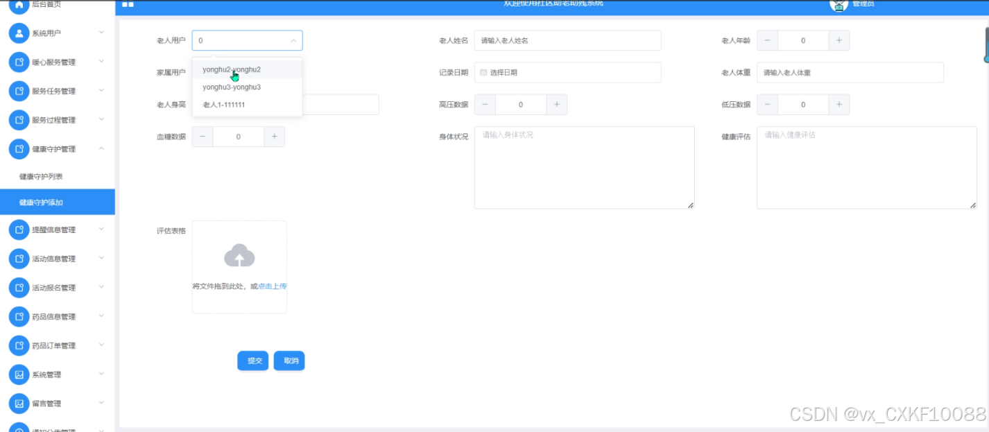 健康守护管理:管理员可以查询、重置、删除和添加老人的健康信息(如身高、体重、身份状况、健康评估等),并上传评估表格。同时,可以为老人设置健康提醒。