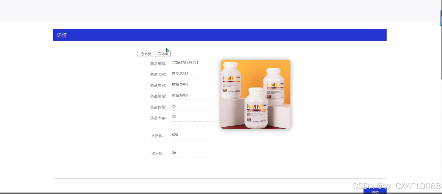 药品信息:药品信息栏目提供了各种药品的详细信息,包括药品的名称、规格、价格和库存状态。用户可以对感兴趣的药品进行点赞和收藏,并且可以直接在平台上进行购买,只需输入购买数量、配送地址和订单备注等信息。