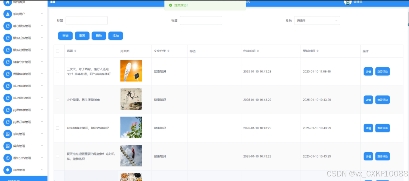 资源管理:管理员可以管理健康科普资源,包括分类和内容的添加、删除和更新,为用户提供丰富的健康知识。
