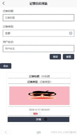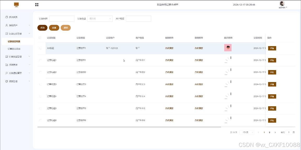 - 记事日志管理:管理员可管理所有记事日志信息的添加、删除、更新等操作,提供搜索功能,支持上传和在线播放或预览视频、音频和图片等附件。