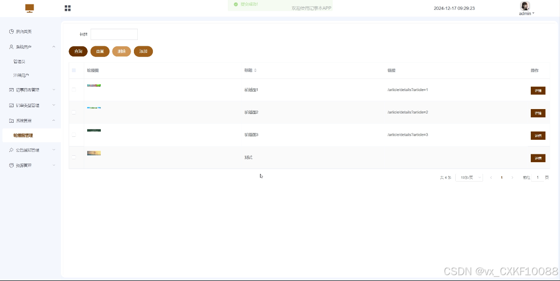 - 系统管理:管理员可管理系统的轮播图信息,包括新增、编辑、删除轮播图,支持附带图片链接。