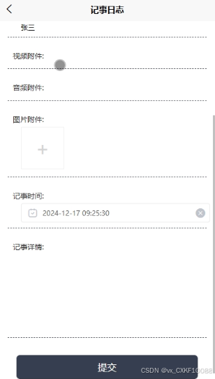 - 记事日志:当用户点击首页的“记事日志”这一菜单时,可进入记事日志添加界面,可根据提示输入记事信息,支持上传图片、视频、音频等附件,提交的记事日志可在“我的”模块中管理。