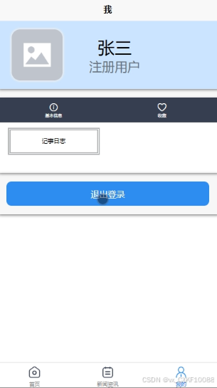 - 我的:注册用户在前台点击“我的”可以对用户的基本信息、收藏、记事日志等信息进行管理。可在“基本信息”中修改资料和密码;可在“收藏”中查看管控自己收藏的各类系统信息;可在“记事日志”中管理自己的记事日志,包括进行增改删查等操作。