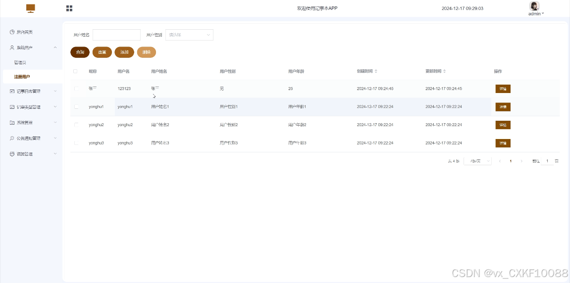 在基于Spring Boot框架下的记事本APP设计与实现中,通过注册用户以及管理员等角色的划分,实现了多层次的用户管理和权限控制,完成了注册、登录、后台首页、系统用户、记事日志管理、记事类型管理、系统管理、公告通知管理、资源管理等多功能模块,能够很好地满足用户在日常生活工作中对记事和管理的需求。