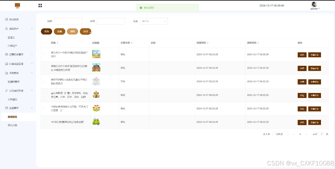 - 资源管理:管理员可管理新闻资讯和资讯分类的添加、编辑、删除等操作,提供搜索功能,支持对新闻资讯的评论管控和查看。