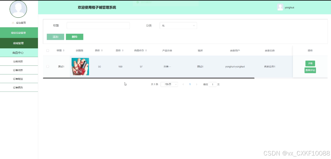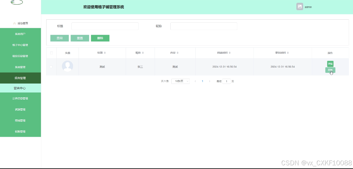 - 格子中心管理:管理员可管理所有格子中心信息,提供搜索功能,实现增改删查等操作,支持查看和管控其评论内容。