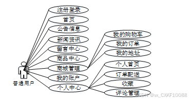 普通用户主要拥有注册登录、首页、公告信息、新闻资讯、留言中心、商品中心、商城管理(我的购物车、我的订单、我的地址)、我的账户、个人中心(个人首页、订单配送、收藏、评论管理)等功能,是系统的主要使用者之一,可浏览各类信息,在线下单、支付,管理订单,提交反馈,发起售后申请等。普通用户角色用例图如下所示。
