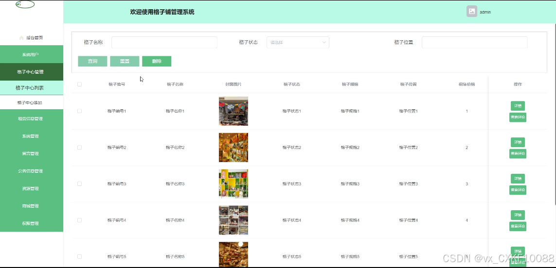 管理员可管理所有格子中心信息,提供搜索功能,实现增改删查等操作,支持查看和管控其评论内容。界面如下图所示。