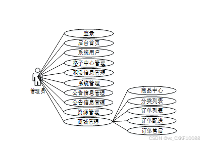 管理员则集成了登录、后台首页、系统用户、格子中心管理、租赁信息管理、系统管理、留言管理、公告信息管理、资源管理、商城管理(商品中心、分类列表、订单列表、订单配送、订单售后)、权限管理等功能,具有搜索、查看、添加、编辑、删除数据的权限,保证系统信息的及时更新和维护,确保系统良性运行。管理员角色用例图如下所示。