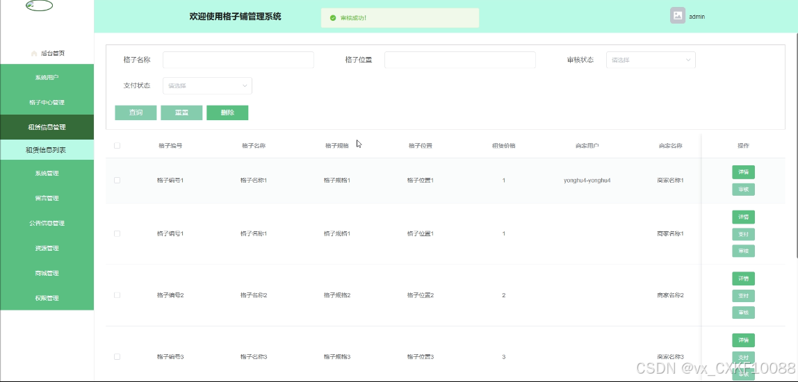 - 租赁信息管理:管理员可管理所有租赁信息,包括查询和删除租赁信息,提供审核、支付操作。
