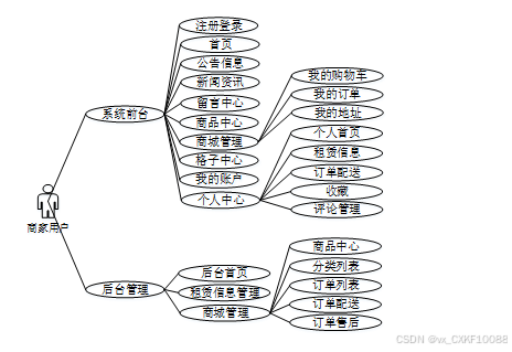 商家用户可同时登录系统前后台,前台功能实现主要包括注册登录、首页、公告信息、新闻资讯、留言中心、商品中心、商城管理(我的购物车、我的订单、我的地址)、格子中心、我的账户、个人中心(个人首页、租赁信息、订单配送、收藏、评论管理)等功能;后台功能则涵盖了后台首页、租赁信息管理、商城管理(商品中心、分类列表、订单列表、订单配送、订单售后)等模块,是系统的主要使用者之一,可浏览格子铺信息,实现在线租赁,负责管理自己商城内容,上架商品,处理订单,提供配送服务。商家用户角色用例图如下所示。