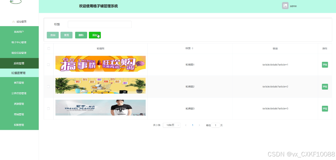 - 系统管理:管理员可管理系统首页的轮播图信息,提供搜索功能,支持上传、删除、更新轮播图内容,可添加图片链接信息。