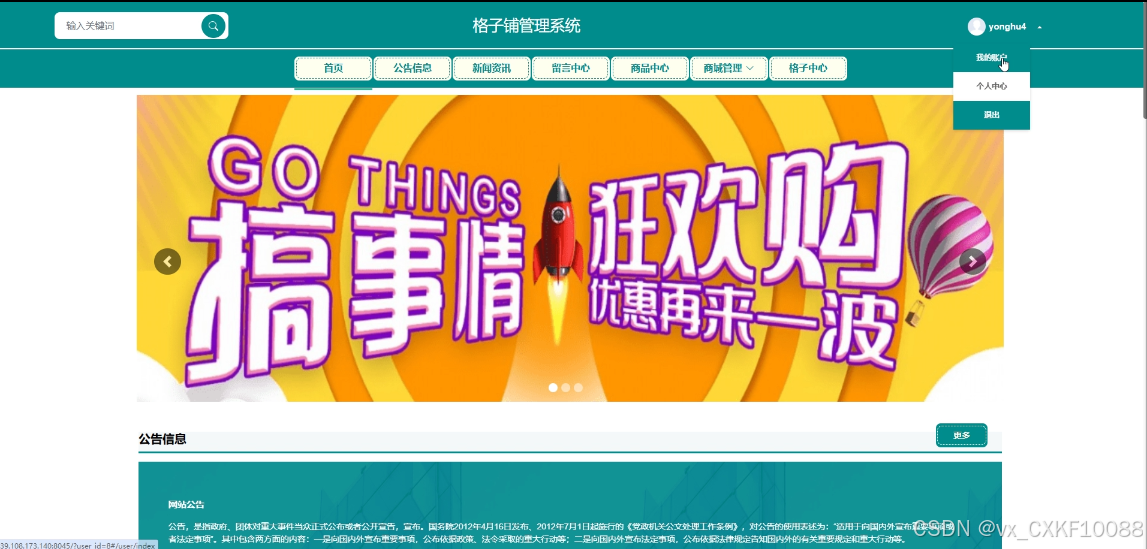 商家用户可同时登录系统前后台,实现权限内的操作,系统前台功能集成注册登录、首页、公告信息、新闻资讯、留言中心、商品中心、商城管理、格子中心、我的账户、个人中心(个人首页、租赁信息、订单配送、收藏、评论管理)等,包括可查看公告信息和新闻资讯;搜索和浏览商品中心和格子中心信息,在线购买商品,租赁格子中心商铺,支付租赁订单等。下面主要对商家用户的后台管理功能做详细说明。