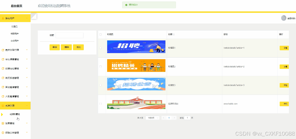 管理员可对首页的轮播图进行管理,进行增删改查操作,可点击详情进行查阅。其界面如下图所示。