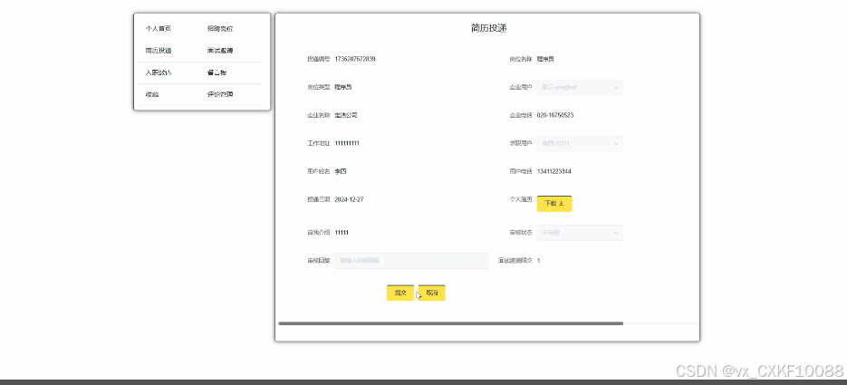 招聘岗位:展示可申请的岗位列表,含协同过滤算法推荐的岗位。