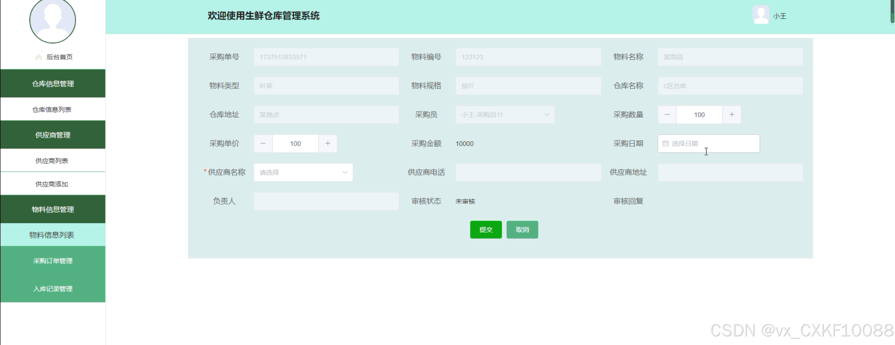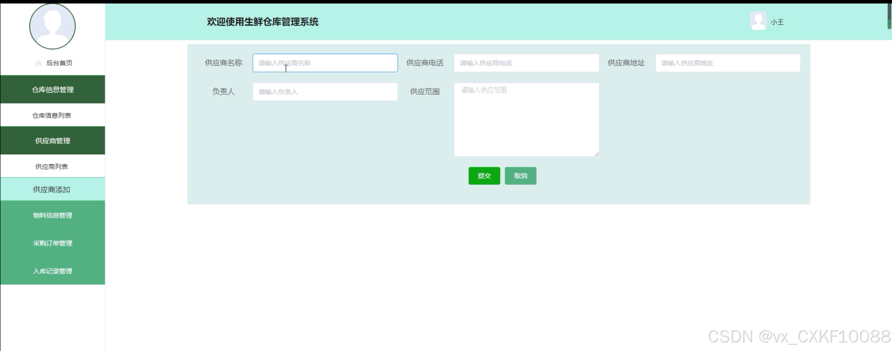 (4)供应商管理:采购员点击可查看供应商列表和供应商天添加;点击进入“供应商添加”可填写相关信息,包括供应商名称、供应商电话、供应商地址、负责人和供应范围。