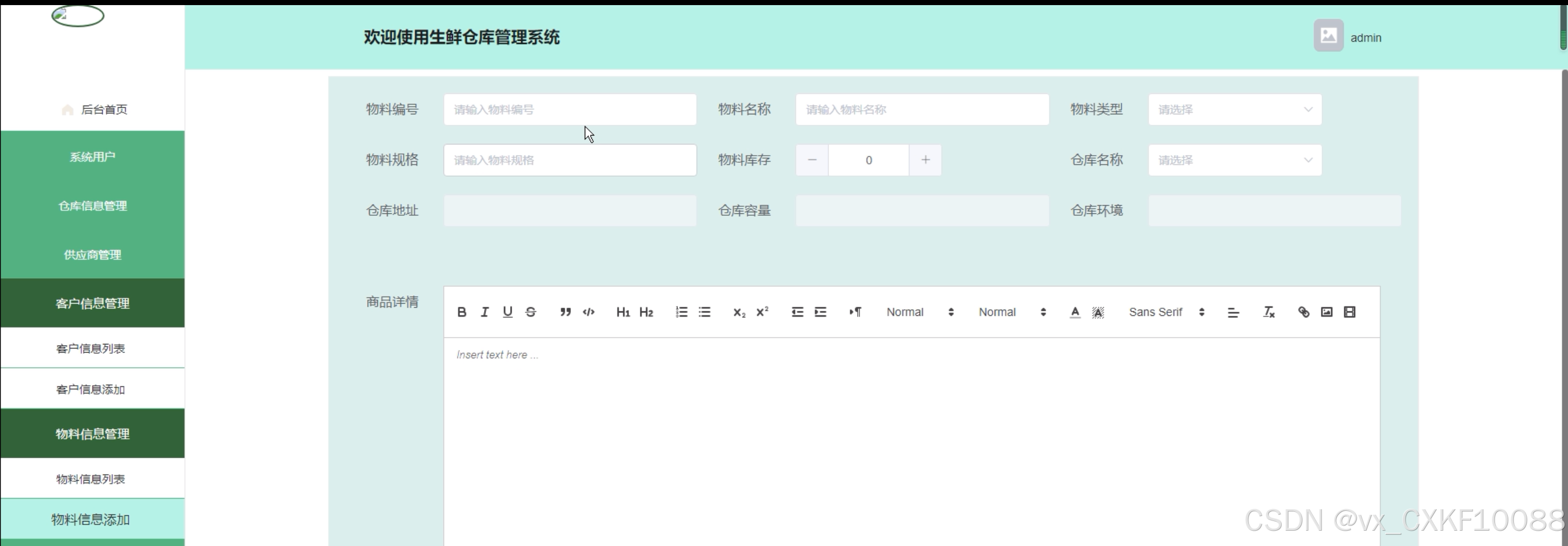 物料信息管理:管理员点击可查看物料信息列表和物料信息添加;点击进入“物料信息添加”可添加详细信息,包括物料编号、物料名称、物料类型、物料规格、物料库存、仓库名称、仓库地址、仓库容量、仓库环境和商品详情。界面如下图所示。