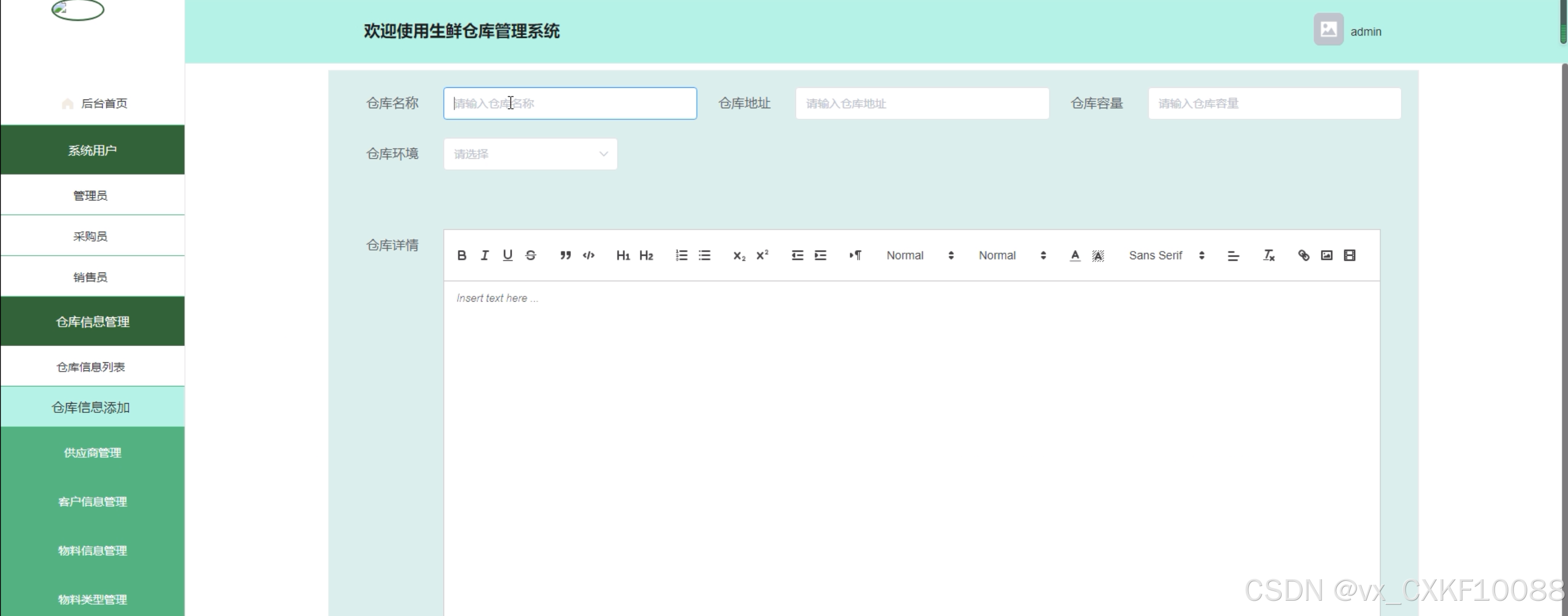 仓库信息管理:管理员点击可查看仓库信息列表和仓库信息添加;点击就进入“仓库信息添加”可填写相关信息,包括仓库名称、仓库地址、仓库容量、仓库环境和仓库详情。界面如下图所示。