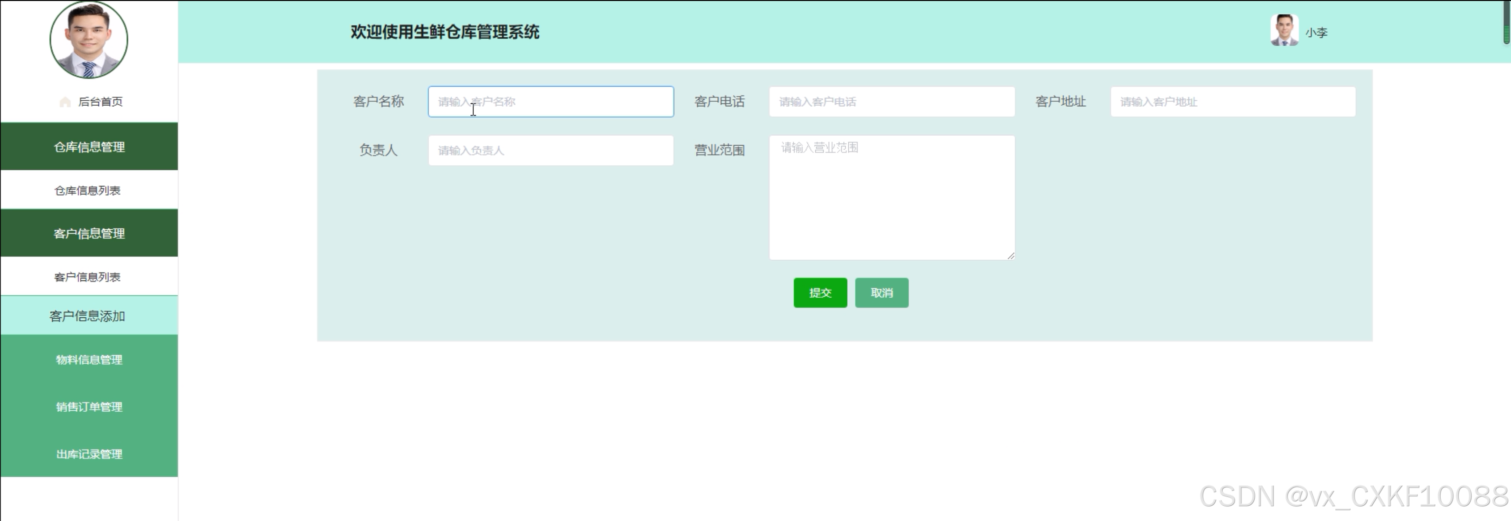 客户信息管理:销售员点击可查看客户信息列表和客户信息添加;点击进入“客户信息添加”可填写相关信息,包括客户名称、客户电话、客户地址、负责人和营业范围。界面如下图所示。